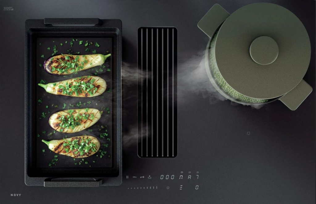 Une hotte murale ou hotte îlot aspire au-dessus des casseroles. La vapeur monte naturellement par convection. Une table aspirante Novy travaille à l’inverse. Elle doit capter les fumées avant qu’elles ne montent. Elle doit intercepter un flux qui part dans toutes les directions.